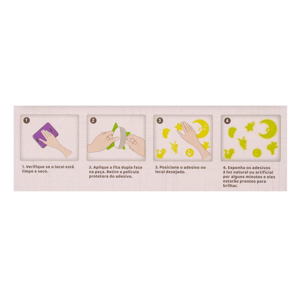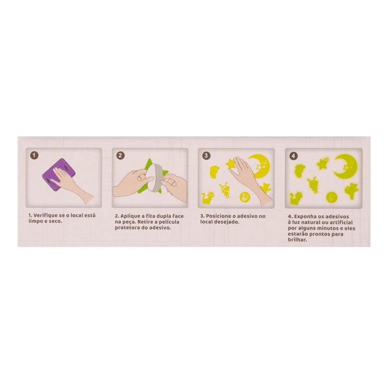 DEIXAR O ADESIVO EXPOSTO À LUZ E DEPOIS DE ALGUNS MINUTOS ELES ESTARÃO PRONTOS PARA BRILHAR. ACOMPANHA FITA DUPLA FACE PARA FIXAÇÃO.