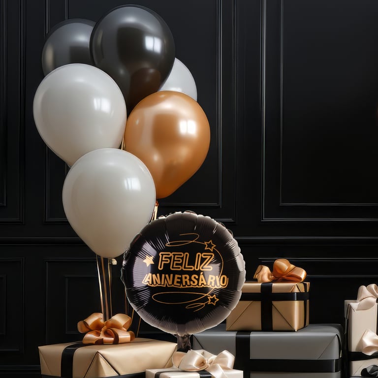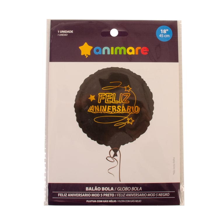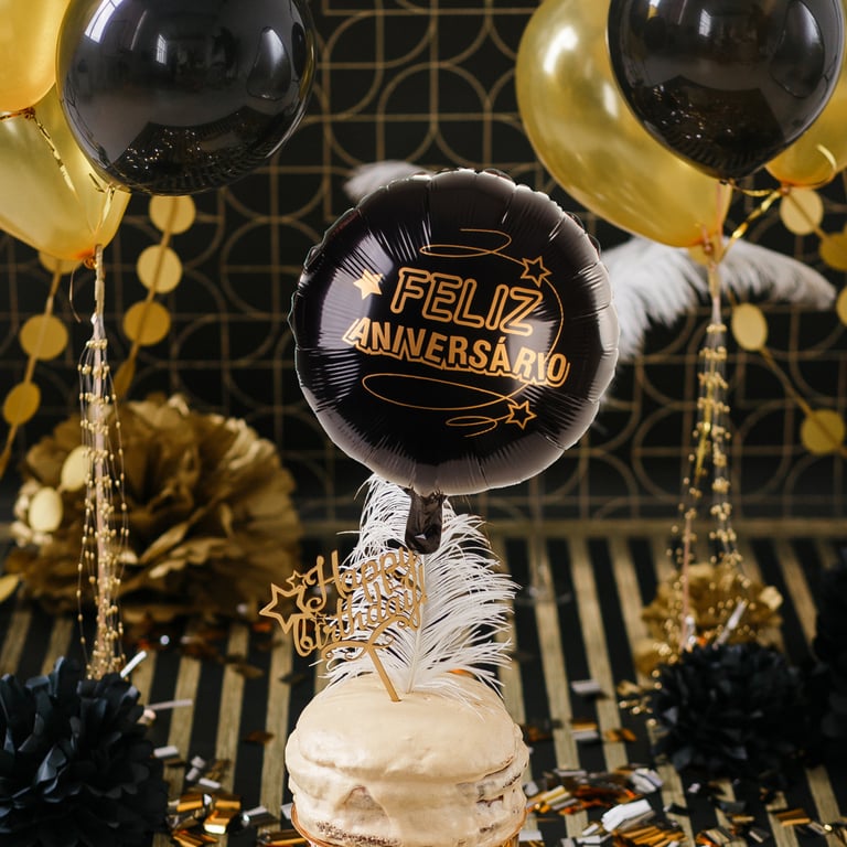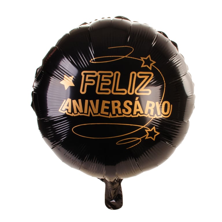 BALÃO METALIZADO 45 CM FELIZ ANIVERSÁRIO PRETO / DOURADO REDONDO