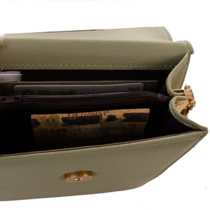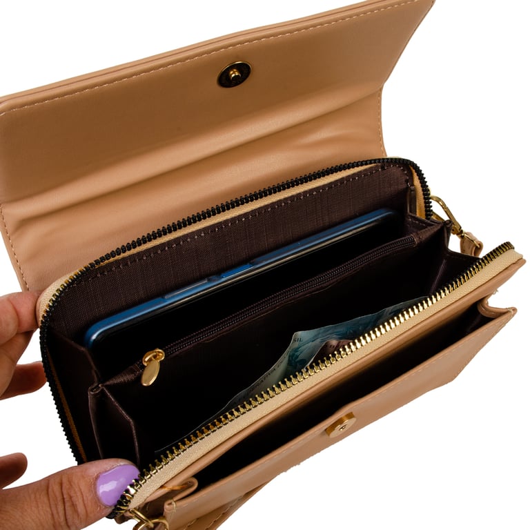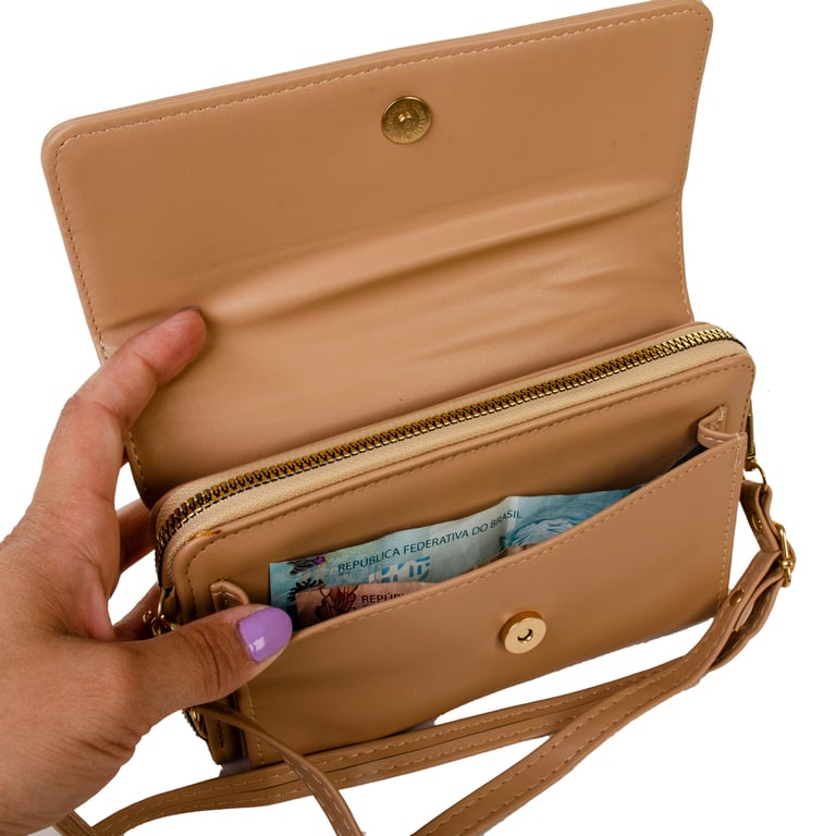 POSSUI BOLSO INTERNO COM ZÍPER, COMPARTIMENTOS PARA CARTÕES, NOTAS E DOCUMENTOS. CABE NOTAS SEM DOBRAR.