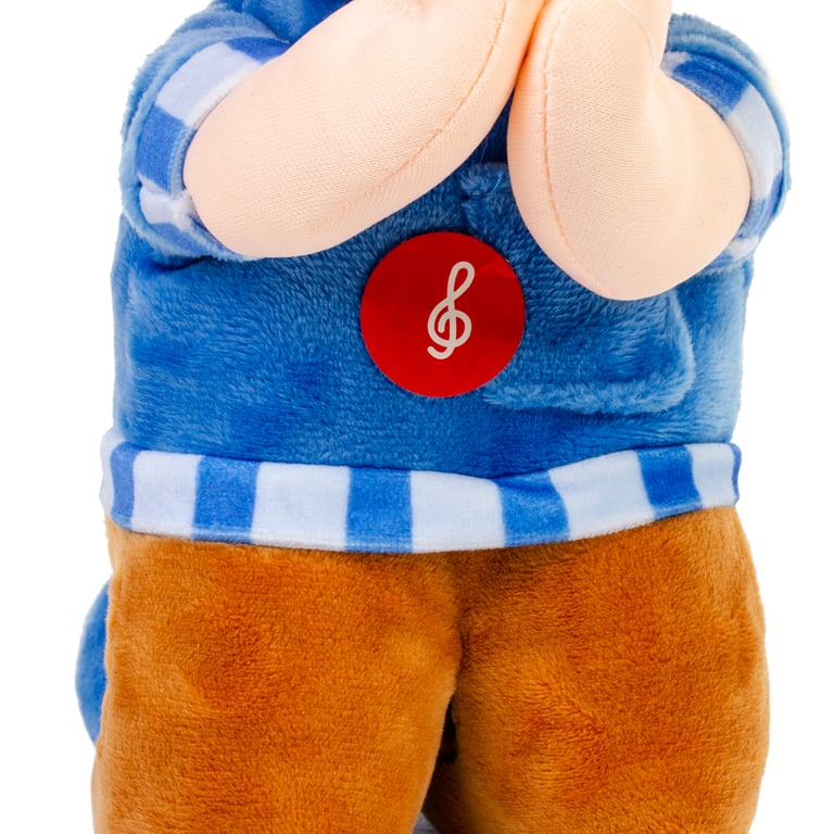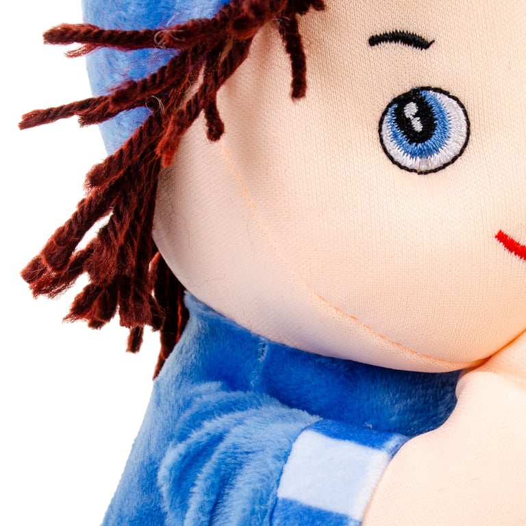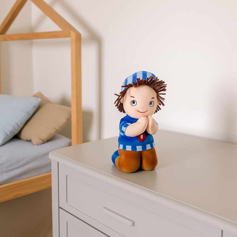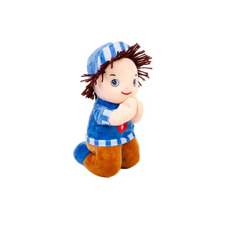 BONECO PELÚCIA 24 CM DE JOELHOS REZA PAI NOSSO BONÉ AZUL
