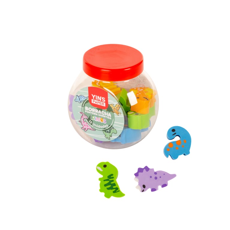 BORRACHA COLORIDA 2,5X1,5 CM PONTEIRA 12 PEÇAS DINOSSAURO NO POTE