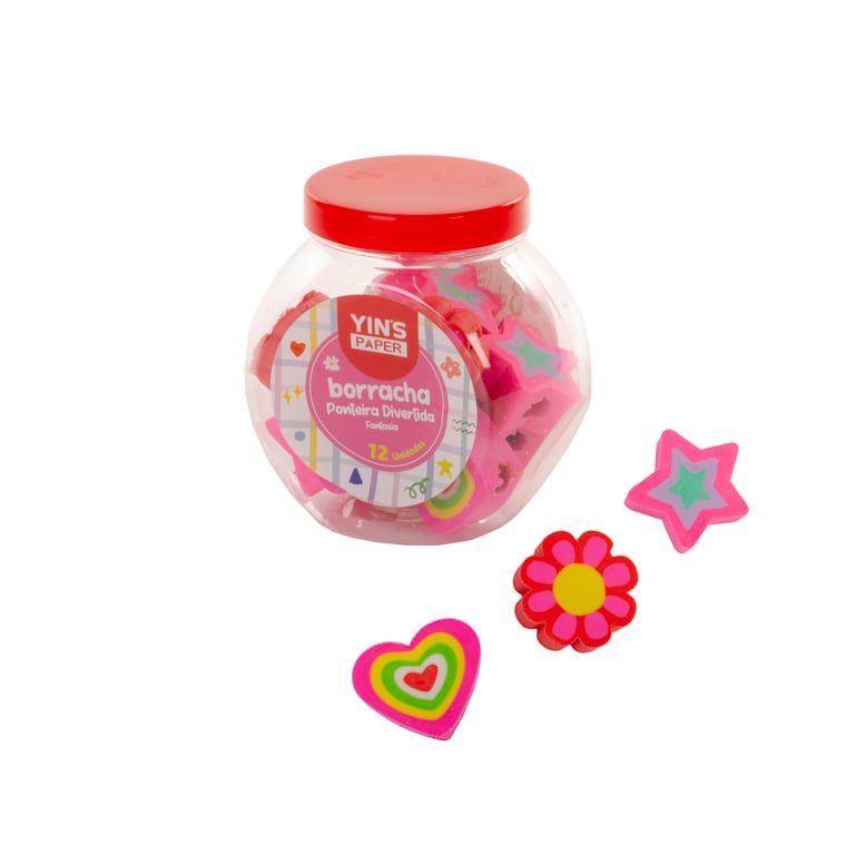 POTE COM 12 BORRACHAS SORTIDAS( FLOR, ESTRELA, CORAÇÃO)
