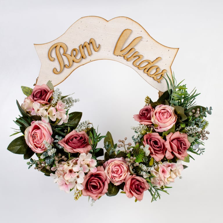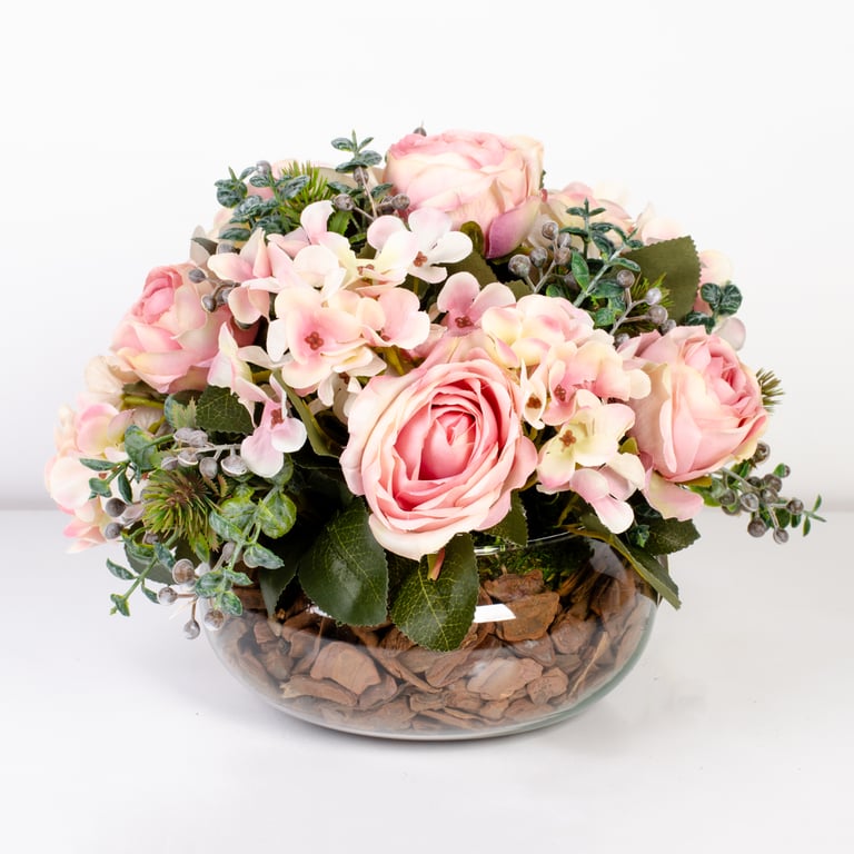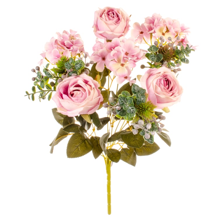 BUQUÊ ROSA X9 6 FLORES 42 CM COM HORTÊNSIA E COMPLEMENTOS