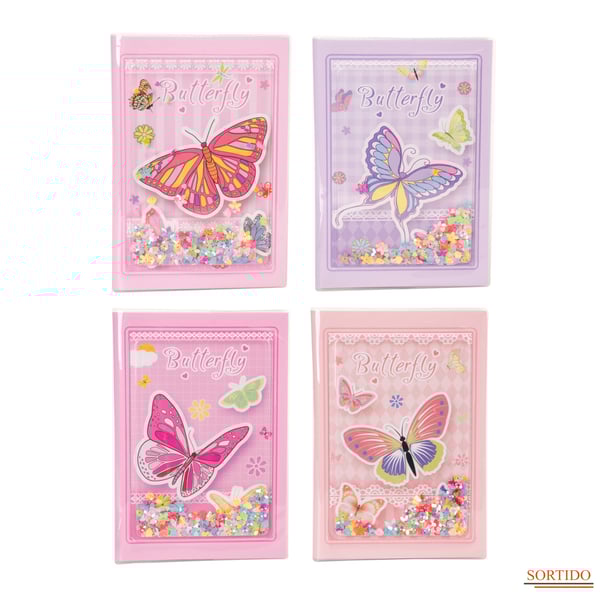 CADERNO / BLOCO ANOTAÇÃO 20X13,6 CM 80 FOLHAS BORBOLETA COM CAPA PLÁSTICA DE APLIQUES