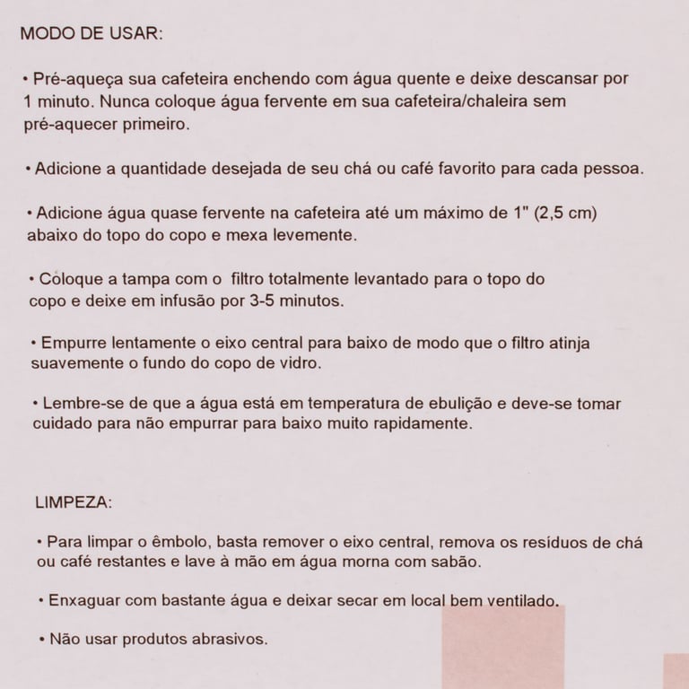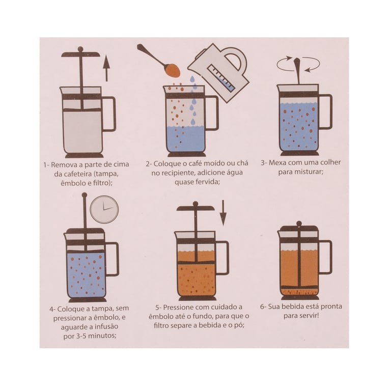 Observações MODO DE USAR:DESPEJE O CAFÉ MOÍDO, ADICIONE ÁGUA FERVENTE DEIXANDO UM ESPAÇO NO TOPO.DEIXE EM INFUSÃO POR 3 A 5 MINUTOS E PRESSIONE LENTAMENTE.