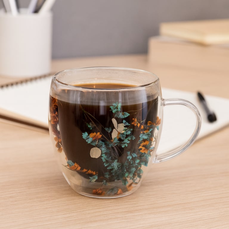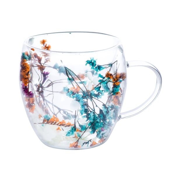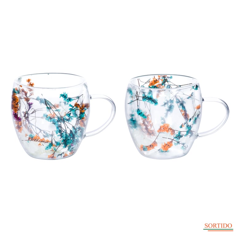 CANECA / XÍCARA VIDRO 250 ML PAREDE DUPLA COM FLORES SECAS