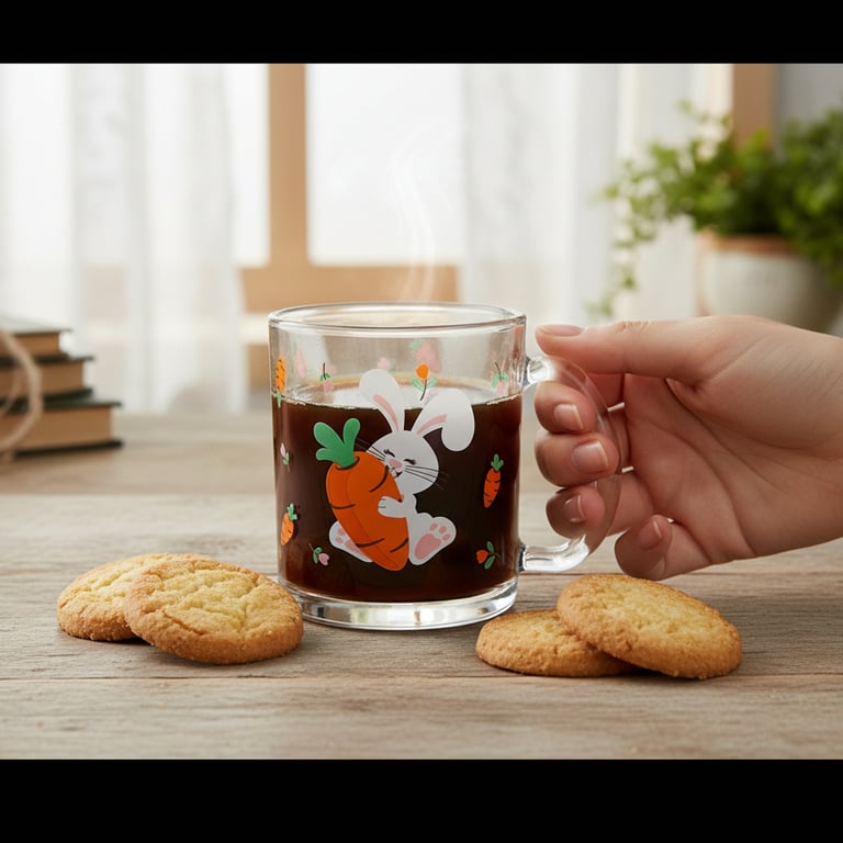 CANECA / XÍCARA VIDRO 320 ML FELIZ PÁSCOA COELHO COM CENOURA E FLORES