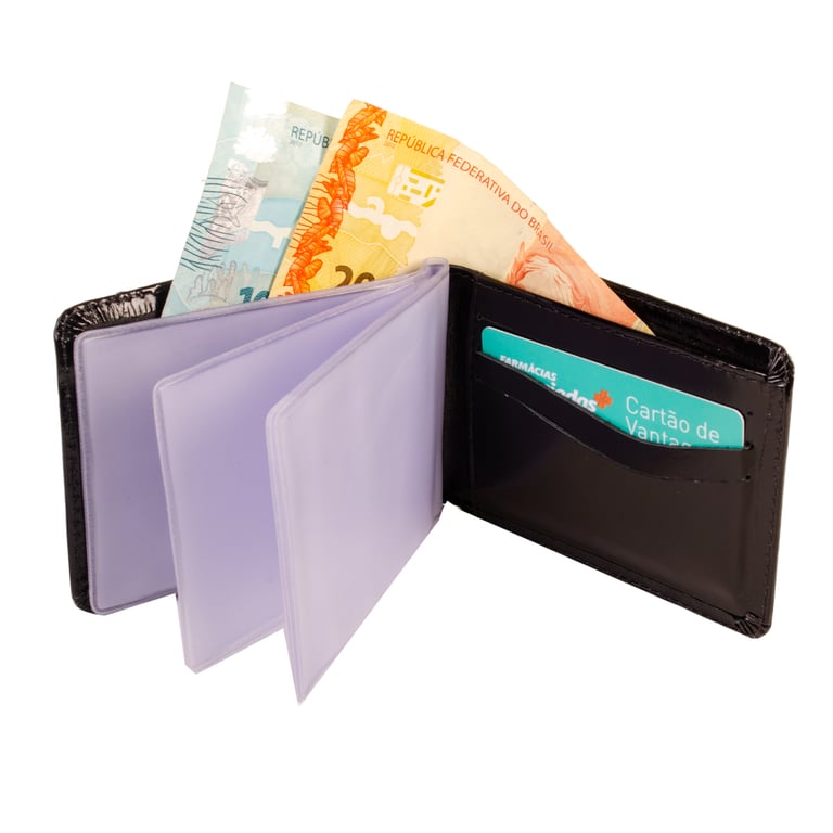 PORTA MOEDAS COM ZÍPER, 6 COMPARTIMENTOS PARA DOCUMENTOS, 2 DIVISÓRIAS PARA NOTAS.