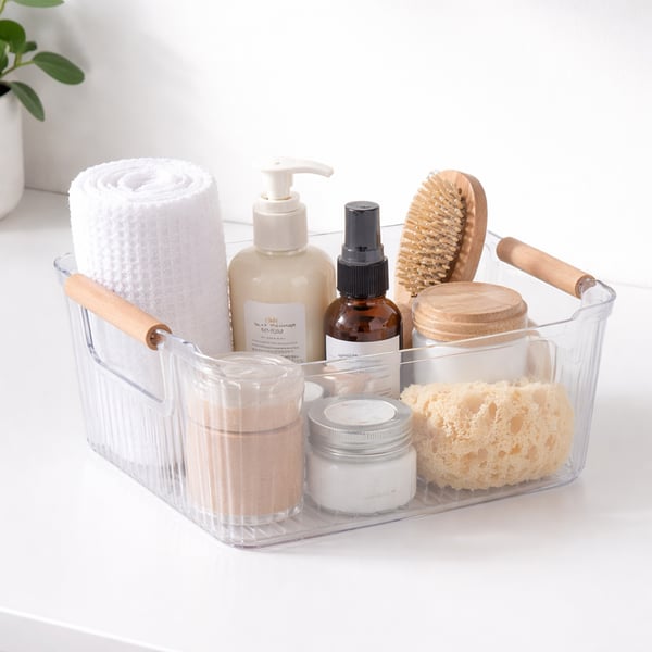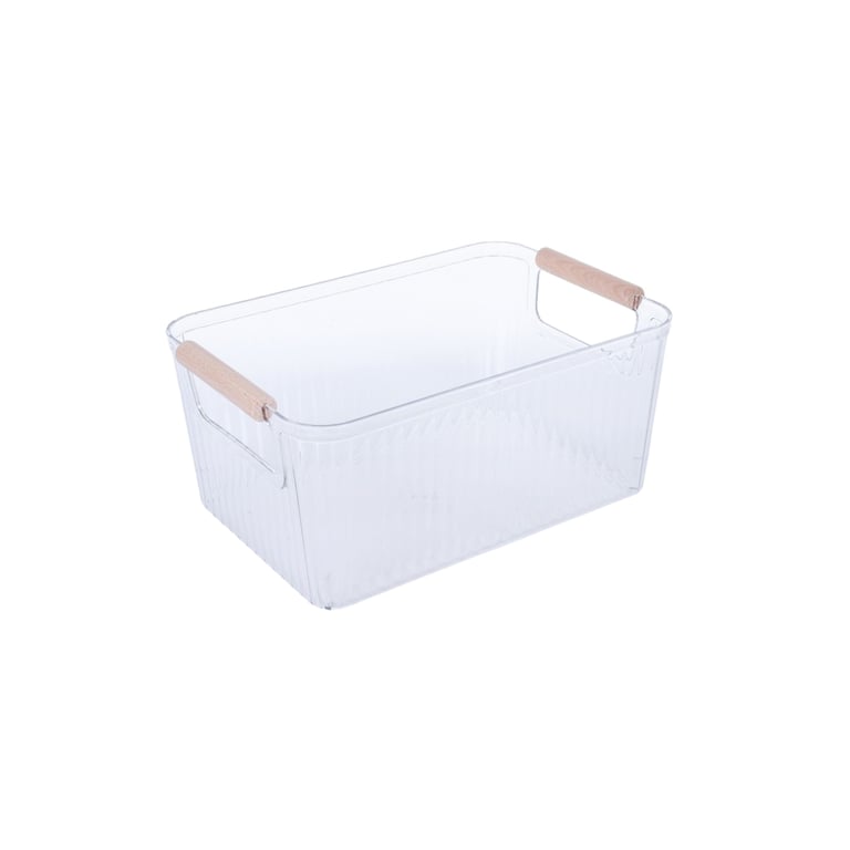 CESTA / ORGANIZADOR PLÁSTICO 12X26,5X18,5 CM CANELADO ALÇAS MADEIRA