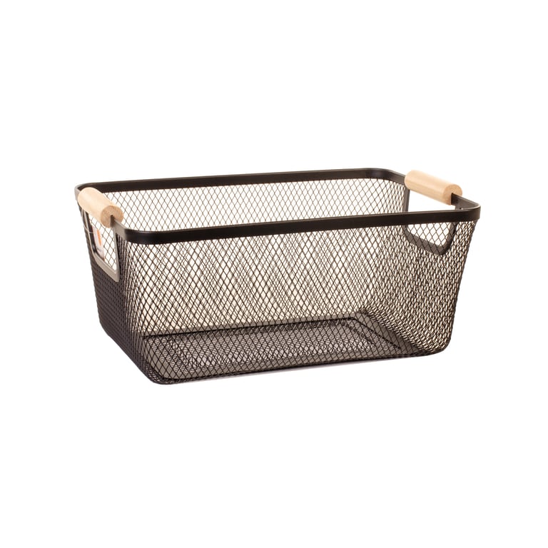 CESTO AÇO 14X32X20,5 CM RETANGULAR TELADO COM ALÇAS MADEIRA