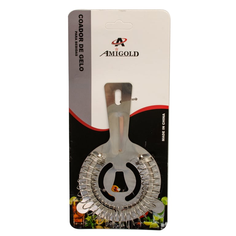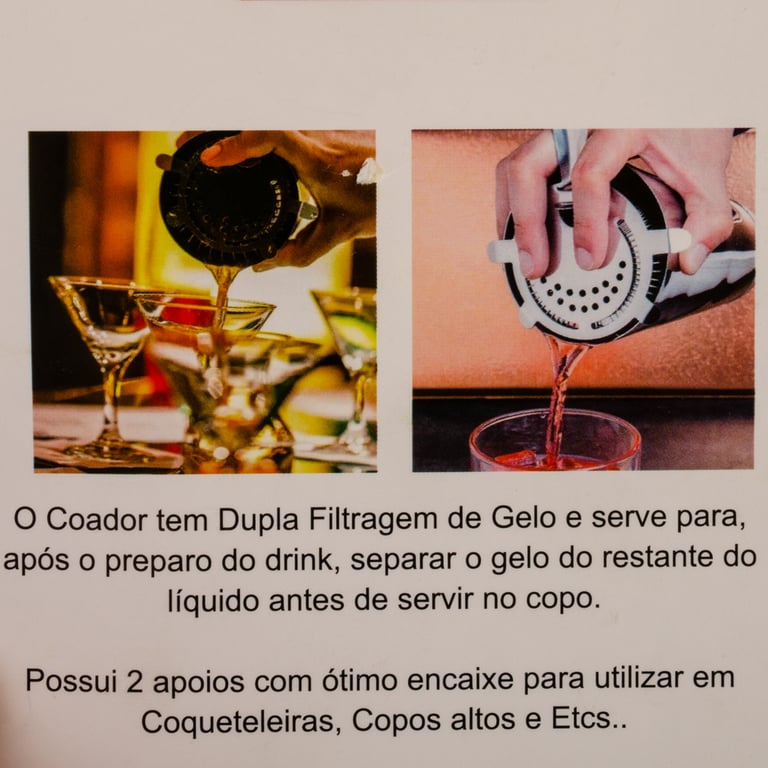Sugestões de uso IDEAL PARA SEPARAR O LÍQUIDO DO GELO, POSSUI 2 APOIOS PARA USAR EM COQUETELEIRAS, COPOS ALTOS,