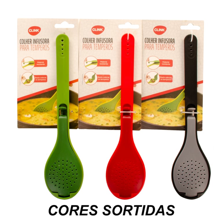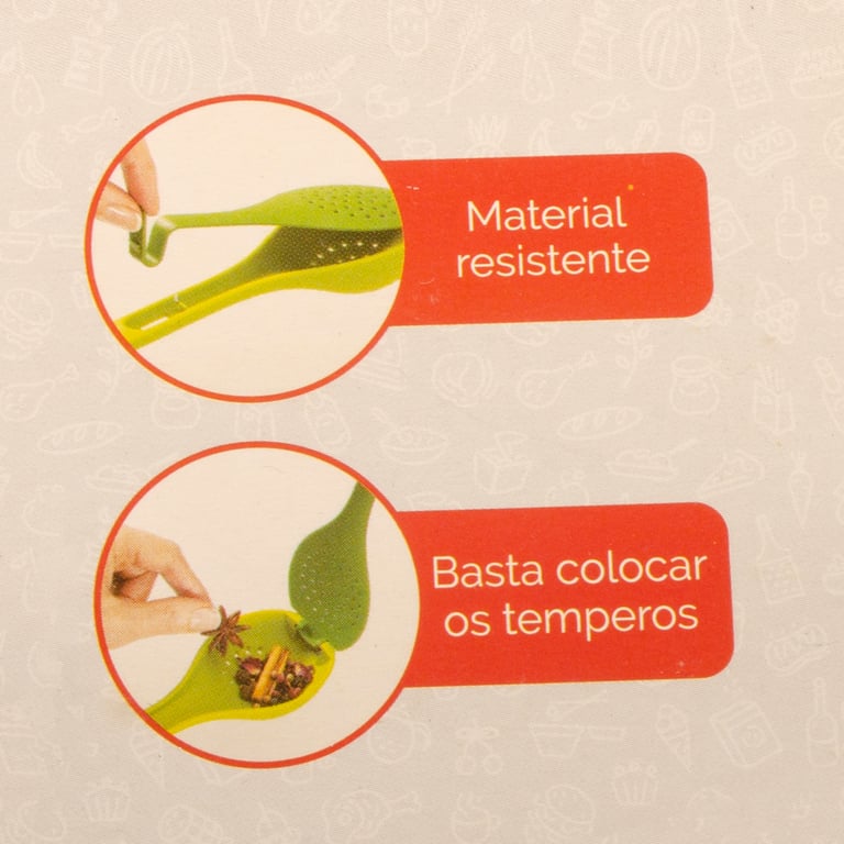 Observações BASTA INSERIR OS TEMPEROS NO INTERIOR DA COLHER, TRAVÁ-LA E UTILIZAR COMO UMA COLHER COMUM, MEXENDO OS ALIMENTOS, ASSIM ELES RECEBERÃO OS SABORES DOS TEMPEROS SEM A NECESSIDADE DA PRESENÇA FÍSICA DE GRÃOS E ERVAS NO ALIMENTO.CABO POSSUI FUROS PARA TIRAR AS FOLHAS DE GALHOS DE TEMPEROS E CHÁS.