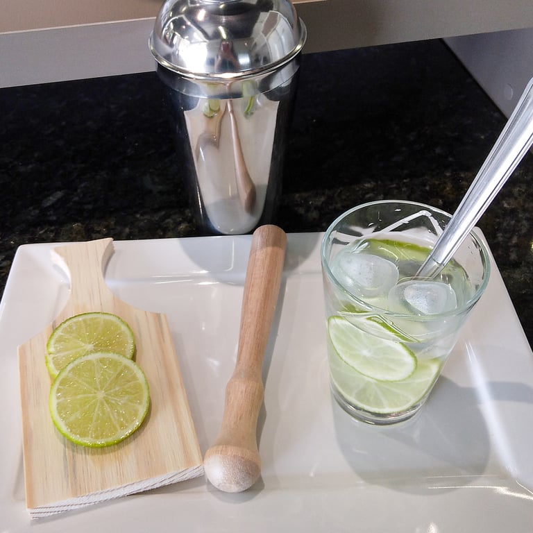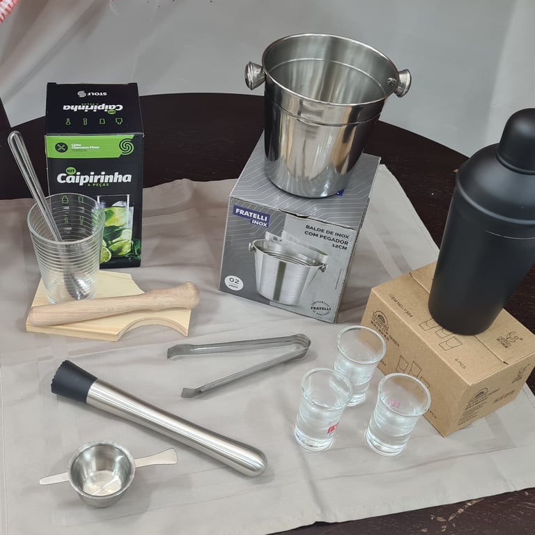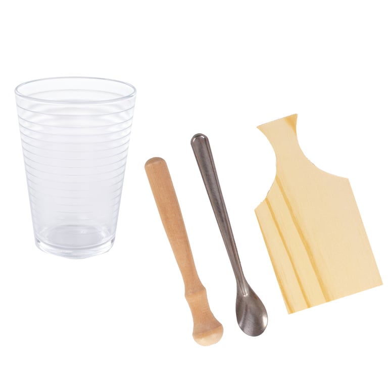 Composição COPO EM VIDRO, COLHER EM INOX, TÁBUA E SOCADOR EM MADEIRA.