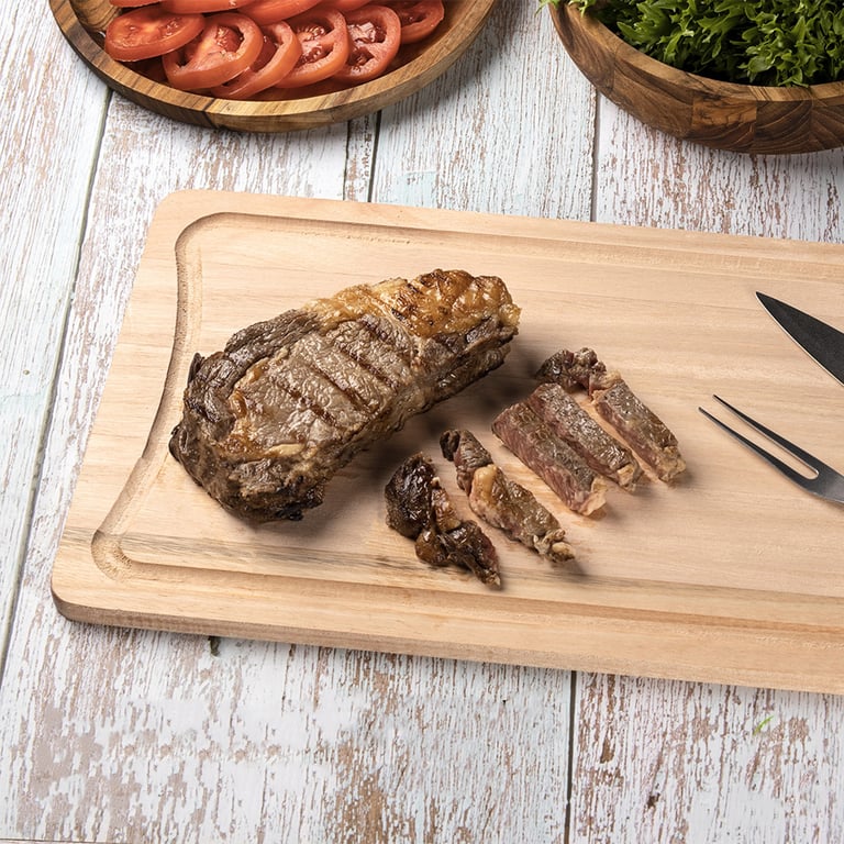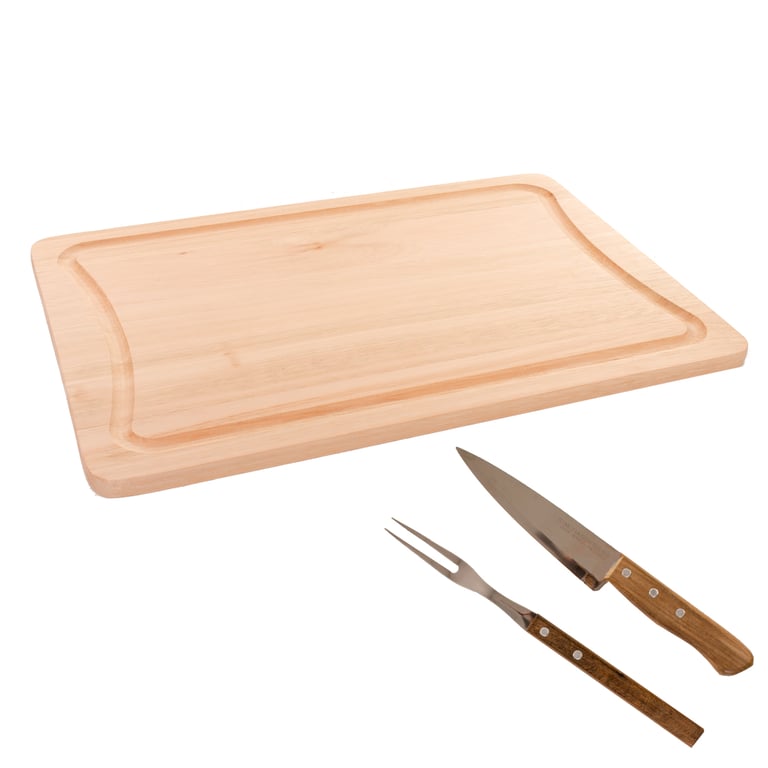 Mais medidas TÁBUA 39X25 CM. FACA: 25X3,5 CM. GARFO: 29X2 CM.