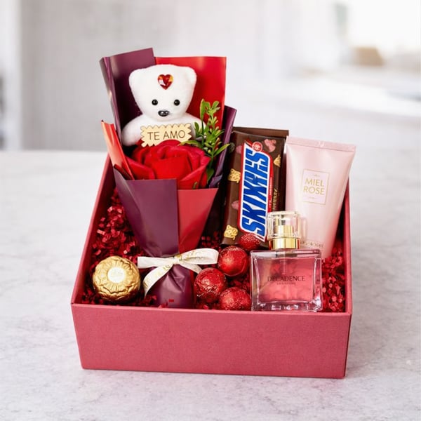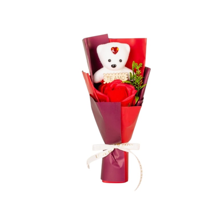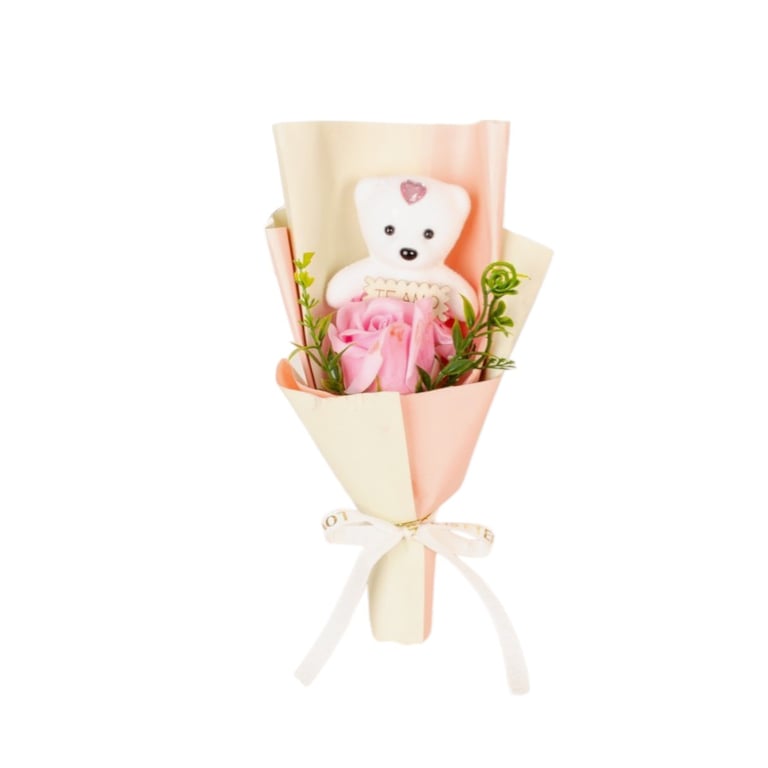 ENFEITE URSO COM BOTÃO DE ROSA 23 CM DECORADO NA CAIXA