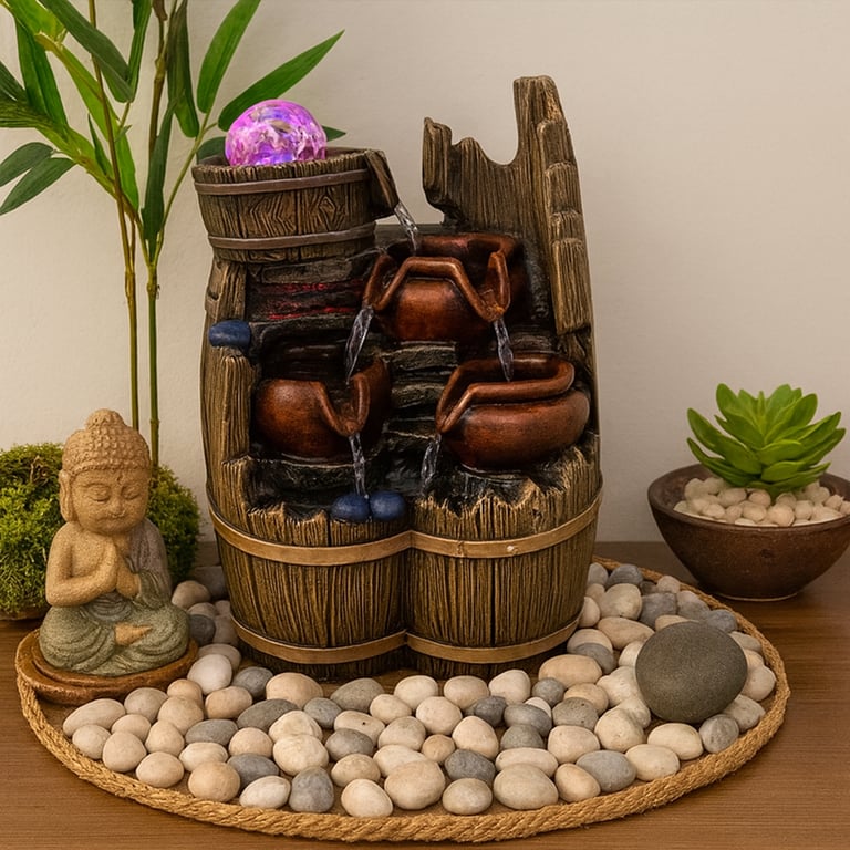 Sugestões de uso ALÉM DE SEREM LINDAS PEÇAS DECORATIVAS AS FONTES DE ÁGUA TRAZEM A SENSAÇÃO DE PAZ, HARMONIA E RELAXAMENTO PARA O AMBIENTE, ATRAVÉS DO SOM DAS QUEDAS DE ÁGUA.