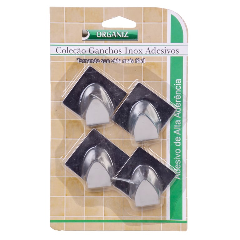 GANCHO PAREDE INOX 4 PEÇAS 4,7X4,7 CM COM ADESIVO