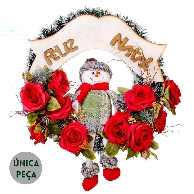 GUIRLANDA FELIZ NATAL 44 CM COM ROSAS E BONECO DE NEVE