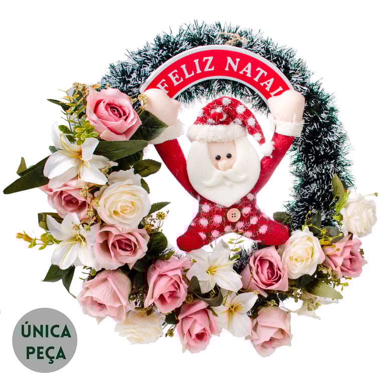 GUIRLANDA FELIZ NATAL 46 CM PAPAI NOEL LÍRIO BOTÃO ROSA