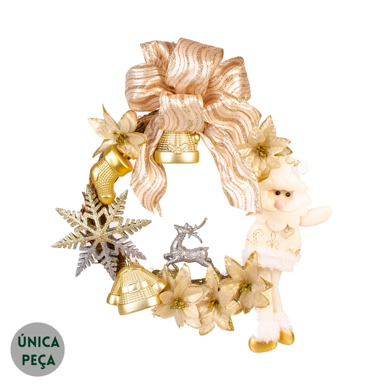 GUIRLANDA NATAL 40 CM PAPI NOEL LAÇO E FLORES DOURADAS
