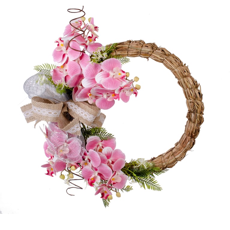 GUIRLANDA ORQUÍDEA 40 CM LAÇO JUTA RENDA E SAMAMBAIA