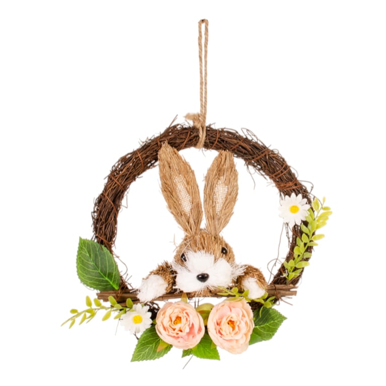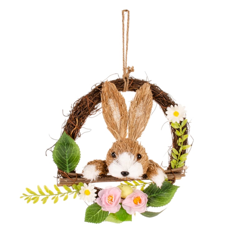GUIRLANDA PÁSCOA 27 CM ROSTO COELHO DE PALHA COM FLORES