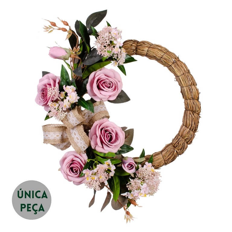 GUIRLANDA ROSA 40 CM COM LAÇO JUTA COM RENDA
