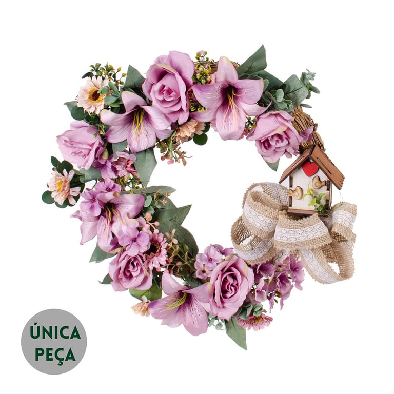 GUIRLANDA ROSA E LÍRIO 38 CM LÍLAS COM HORTÊNSIA E CASA