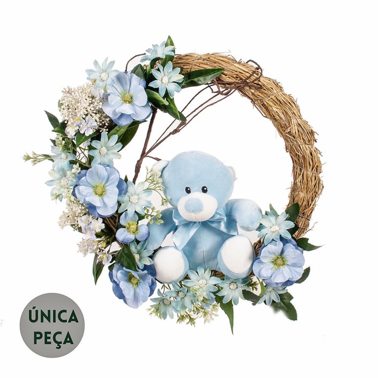 GUIRLANDA URSO AZUL 36 CM COM FLORES DE CAMPO