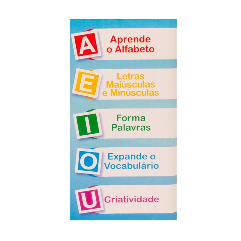 Sugestões de uso APRENDE ALFABETO, LETRAS MAIÚSCULAS E MINÚSCULAS, FORMA PALAVRAS, EXPANDE O VOCABULÁRIO, CRIATIVIDADE