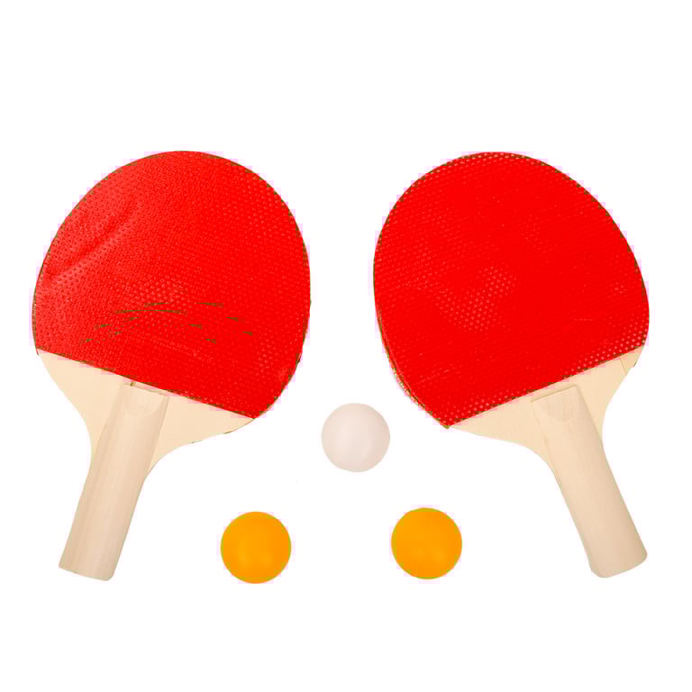 Composição RAQUETES EM MADEIRA E BORRACHA,BOLAS EM PLÁSTICO.