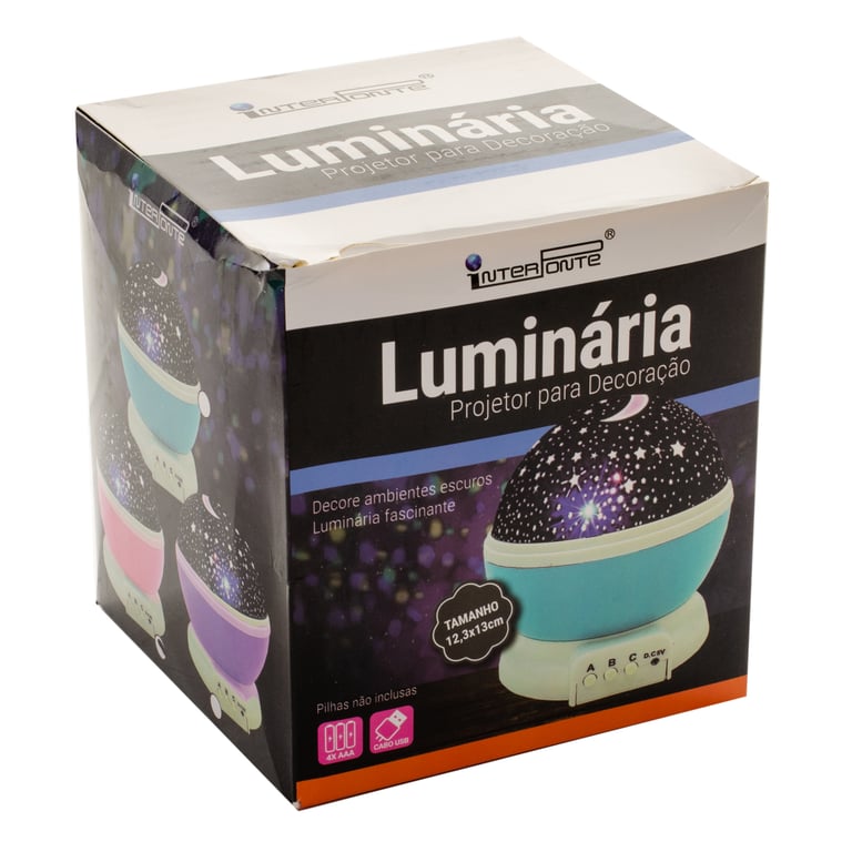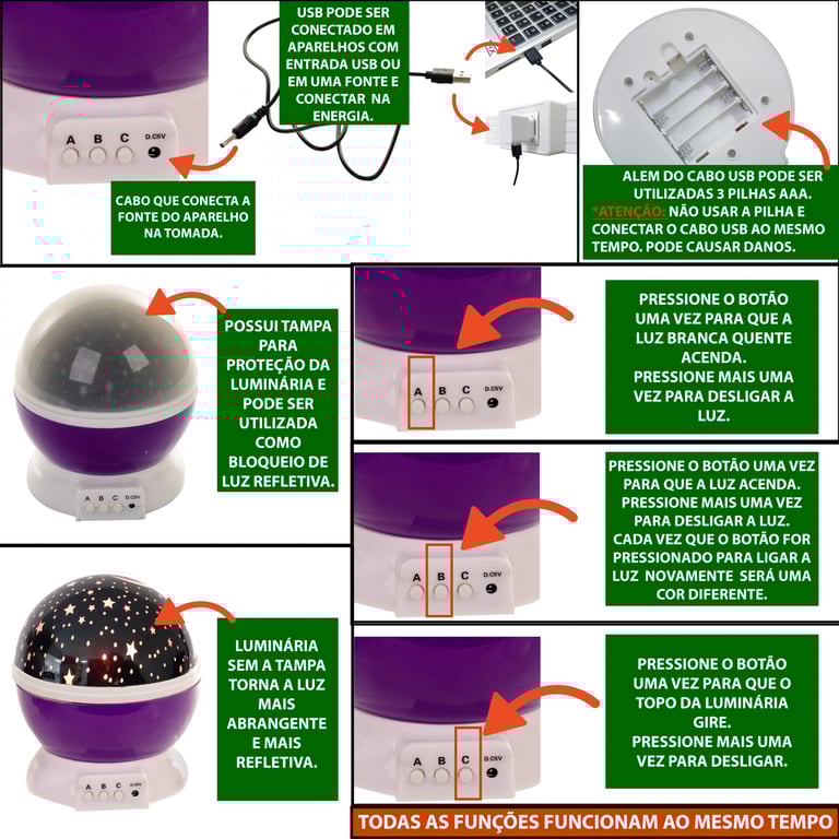 Observações UTILIZA 3 PILHAS AA MÉDIA ( NÃO INCLUSAS), OU CABO USB ( INCLUSO), POSSUI BOTÃO: LIGA E DESLIGA, PARA TROCAR AS CORES (SÃO VÁRIAS OPÇÕES DE CORES) E LIGA E DESLIGA A ROTAÇÃO. A TAMPA PRECISA SER RETIRADA PARA REFLETIR NA PAREDE OU TETO