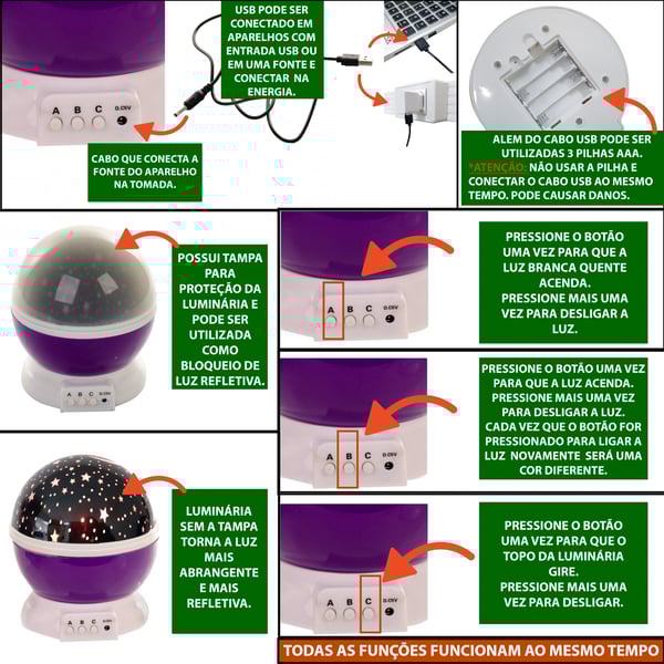 Observações UTILIZA 3 PILHAS AA MÉDIA ( NÃO INCLUSAS), OU CABO USB ( INCLUSO), POSSUI BOTÃO: LIGA E DESLIGA, PARA TROCAR AS CORES (SÃO VÁRIAS OPÇÕES DE CORES) E LIGA E DESLIGA A ROTAÇÃO. A TAMPA PRECISA SER RETIRADA PARA REFLETIR.