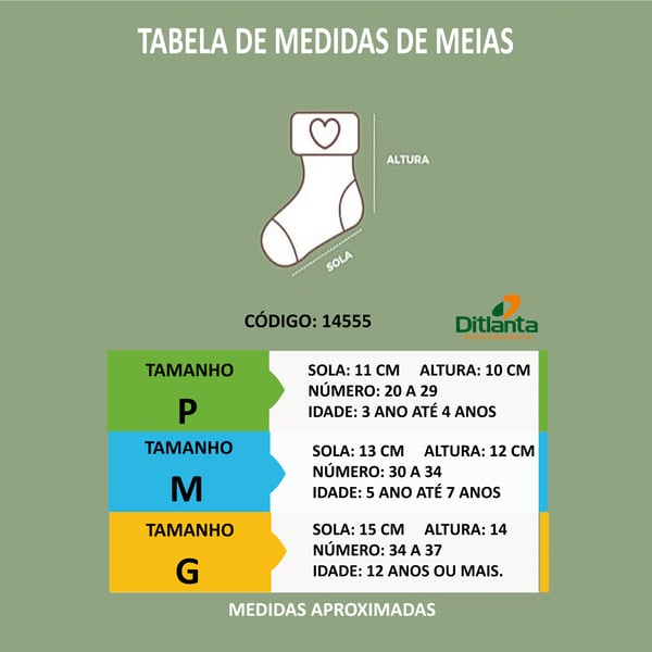 Mais medidas MEDIDAS DA SOLA DA MEIA. P 11 CM 2 A 4 ANOS (N 18 A 23) M 13 CM 5 A 7 ANOS (N 30 A 34) G 15 CM 8 A 12 ANOS OU MAIS (N 34 A 37).