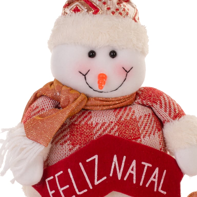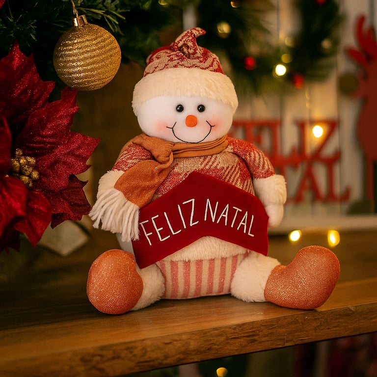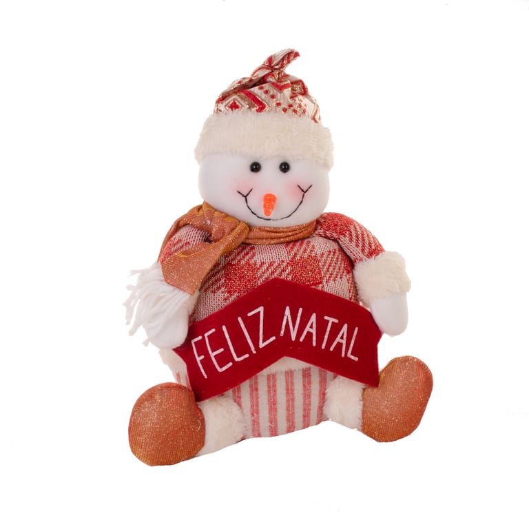 PAPAI NOEL / BONECO DE NEVE 30 CM SENTADO PLACA FELIZ NATAL CALÇA LISTRADA COM PESO