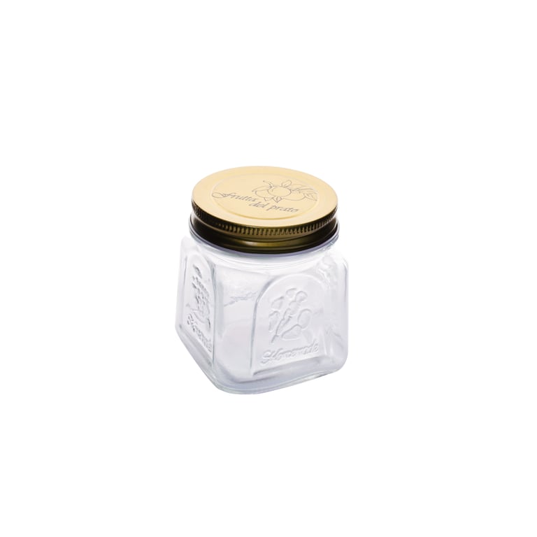 Composição POTE EM VIDRO E TAMPA EM METAL.