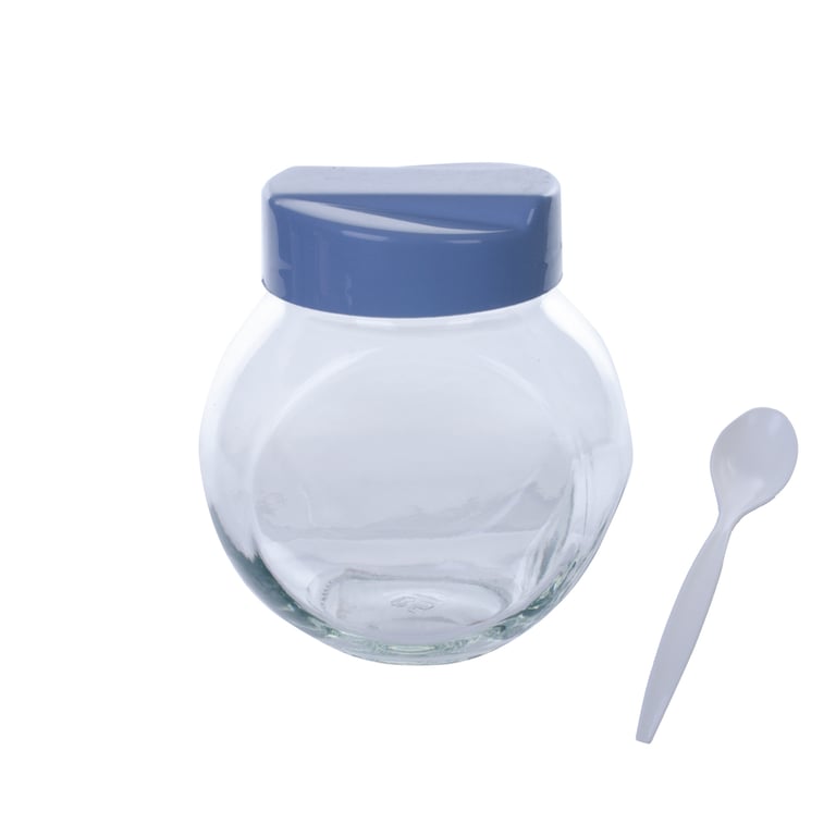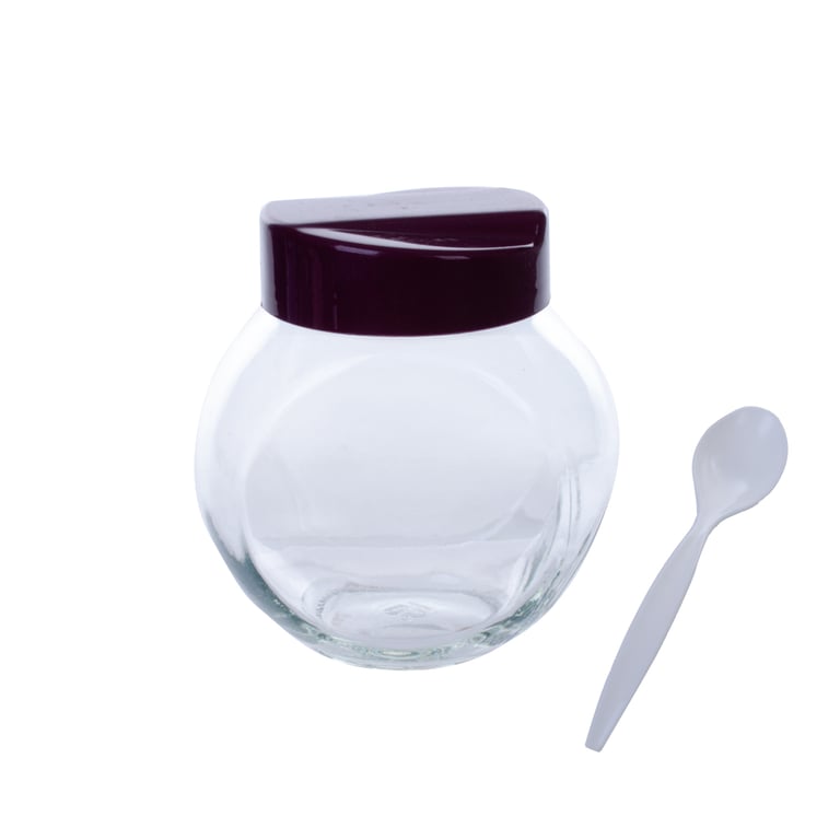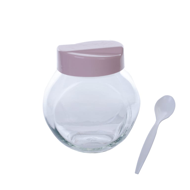 Composição VIDRO ESPESSO, TAMPA E COLHER EM PLÁSTICO.