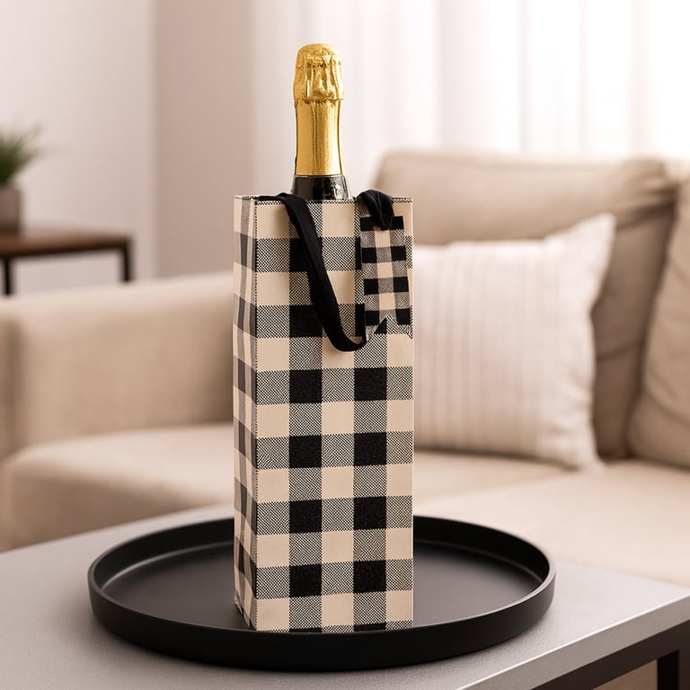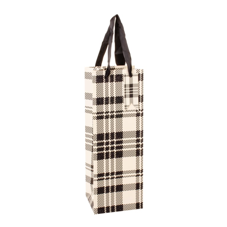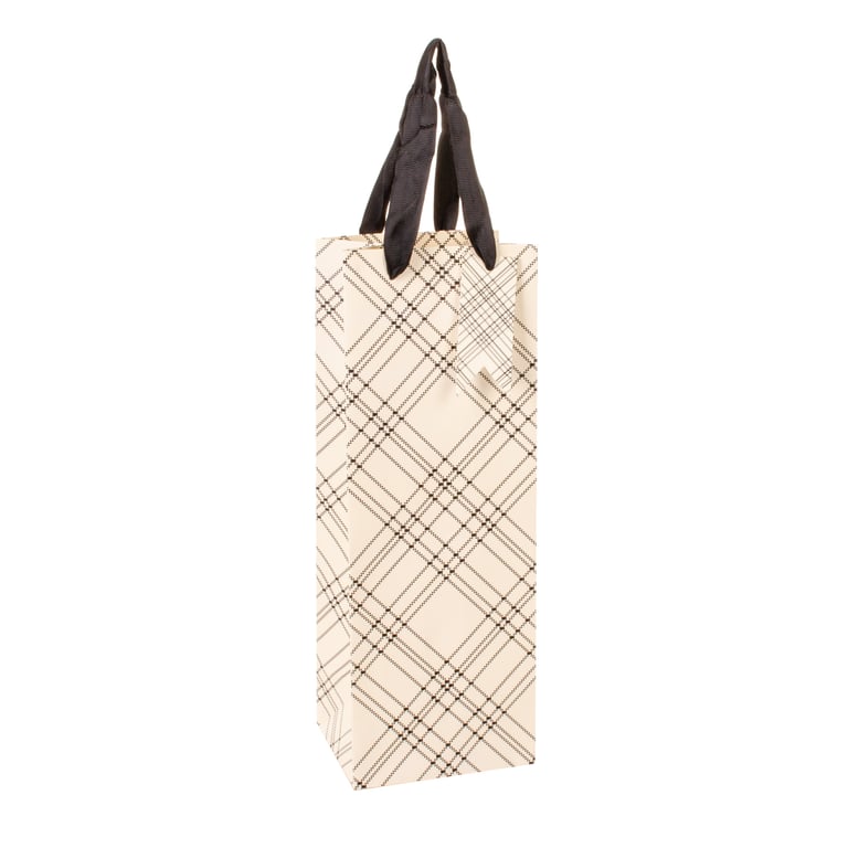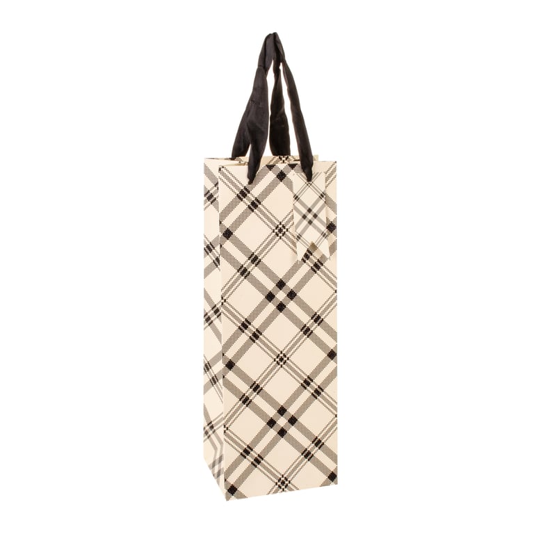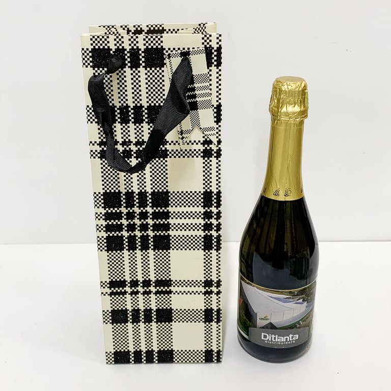 SACOLA GARRAFA 34,5X12,5X10 CM BEGE / XADREZ PRETO GLITTER CARTONADA