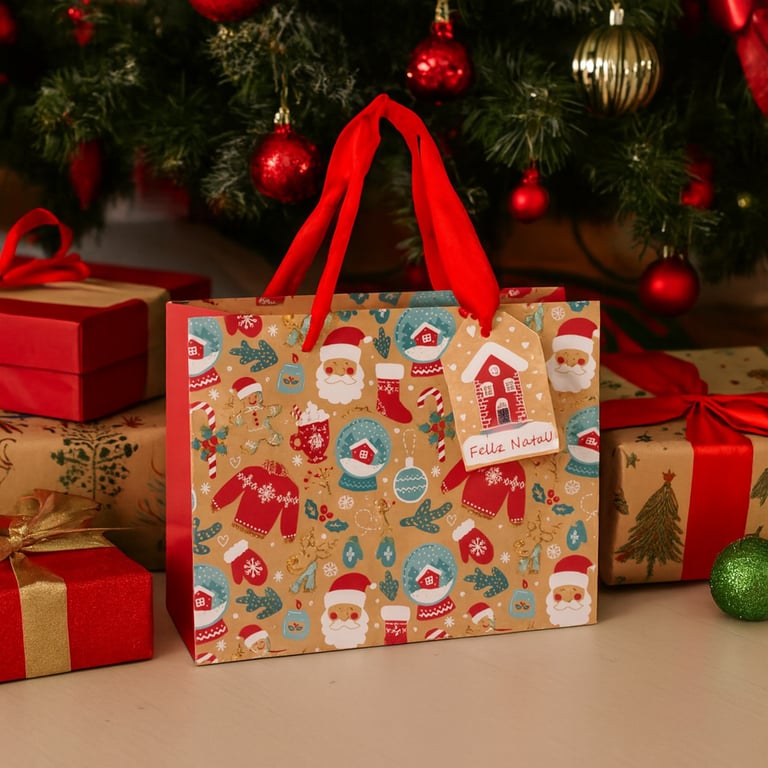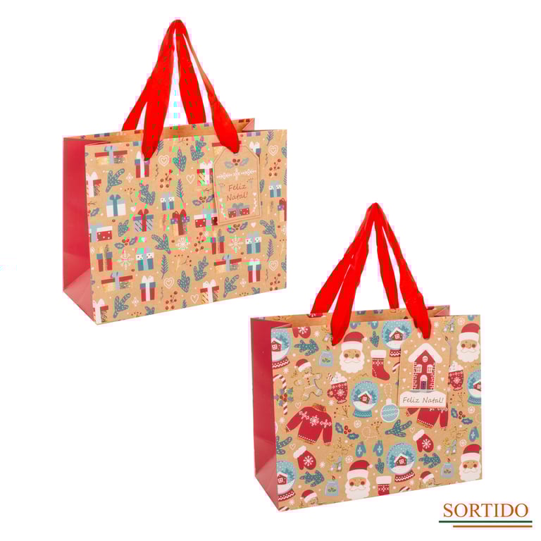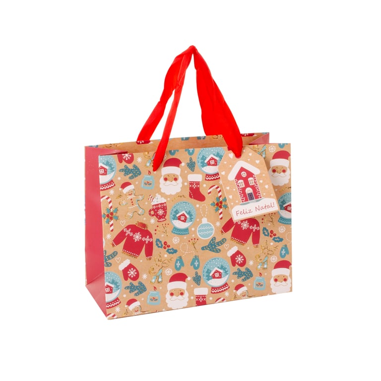 SACOLA NATAL 18X23X10 CM BEGE COM ESTAMPADA CARTONADA