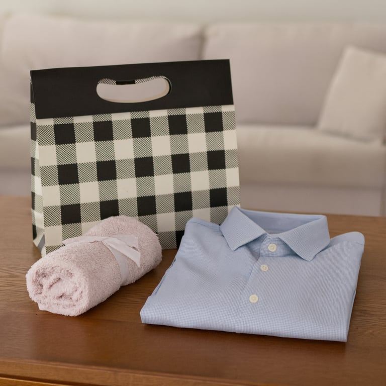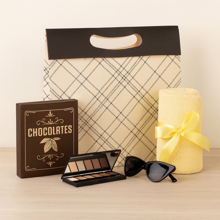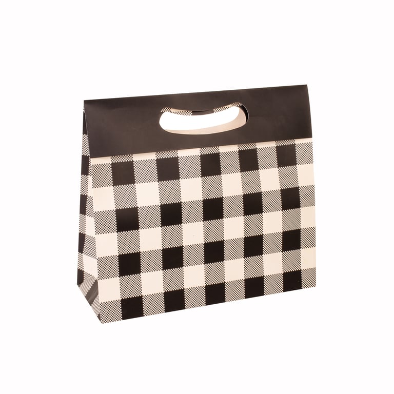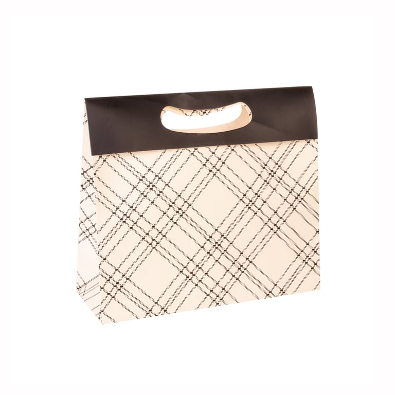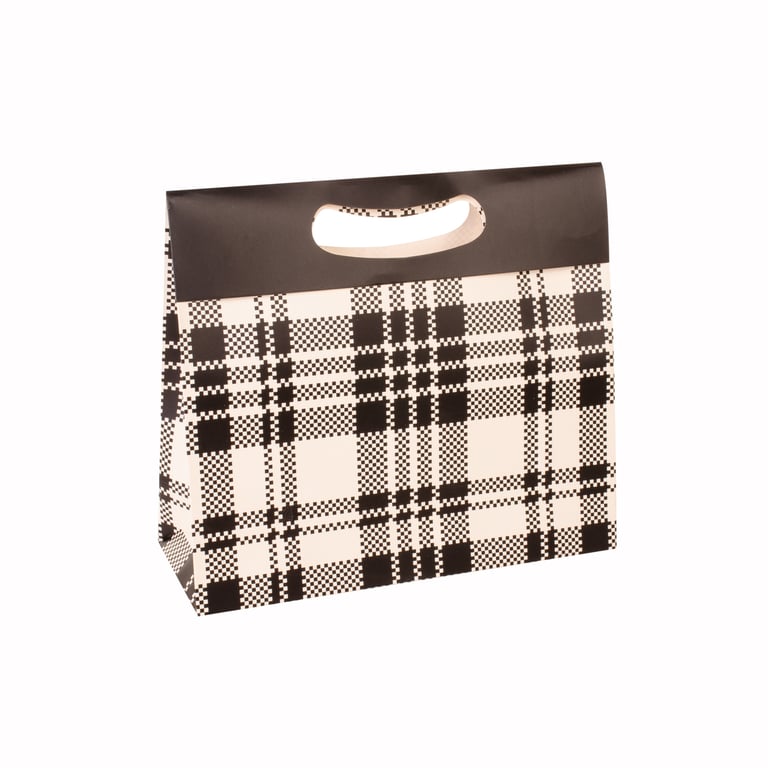 SACOLA PRESENTE 24X27X10 CM BEGE / XADREZ PRETO CARTONADA