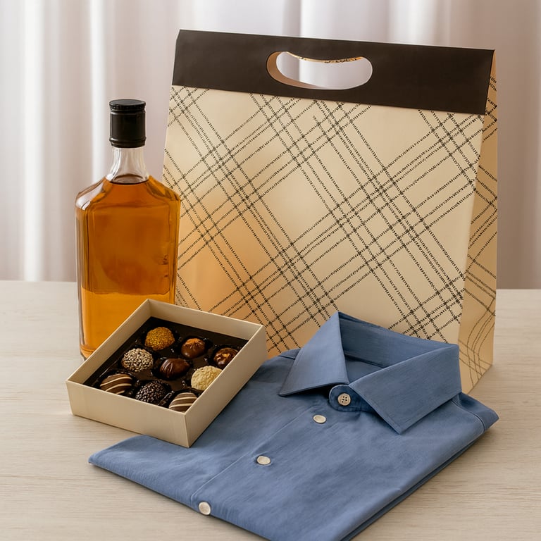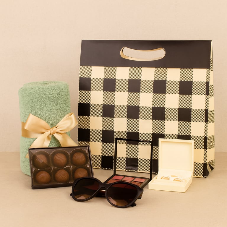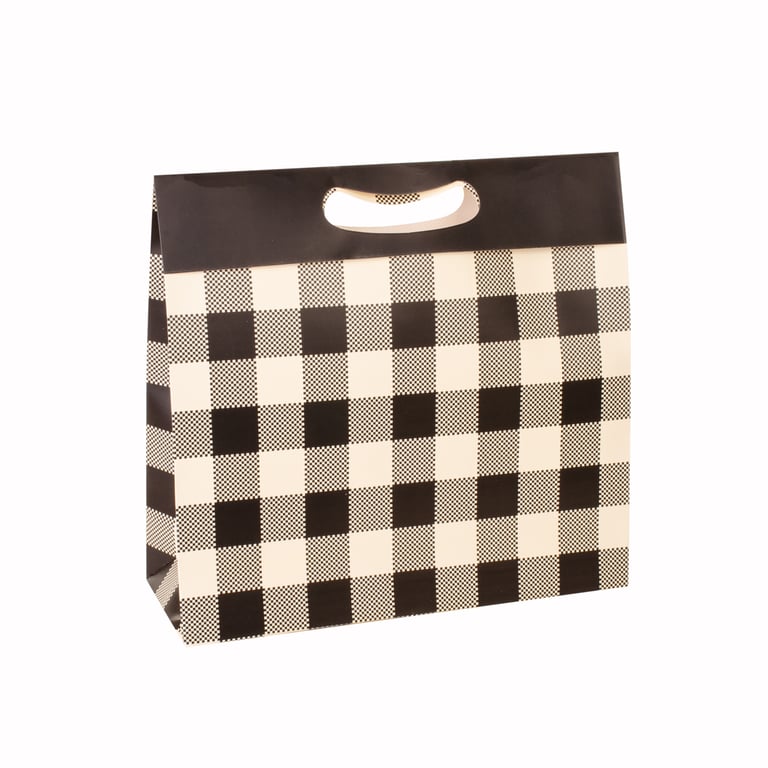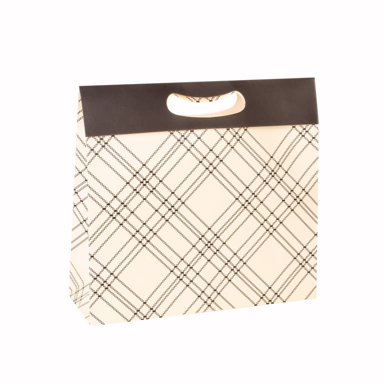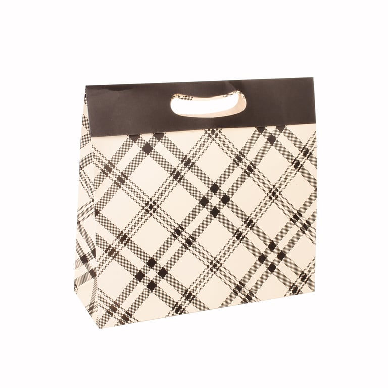 SACOLA PRESENTE 30X32X11 CM BEGE / XADREZ PRETO CARTONADA