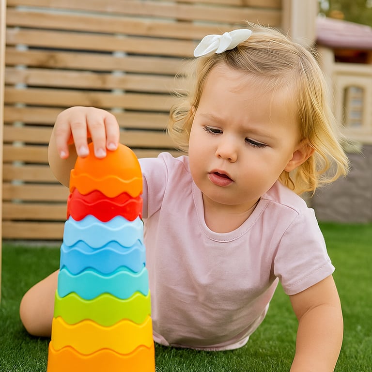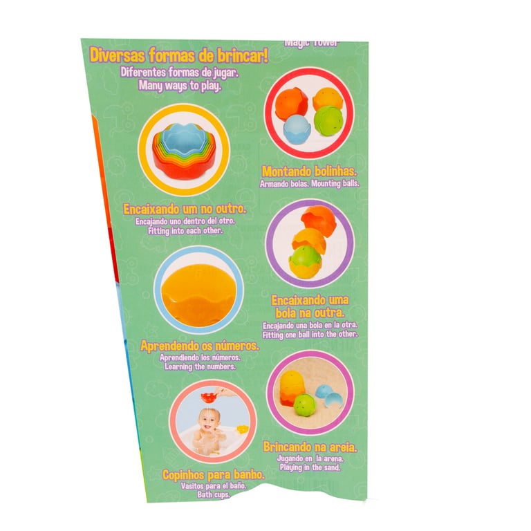 EMPILHANDO ATÉ FORMAR UMA TORRE, ENCAIXANDO UMA PEÇA DENTRO DA OUTRA, MONTANDO BOLINHAS, ENCAIXANDO UMA BOLA DENTRO DA OUTRA, APRENDENDO NÚMEROS, COPINHOS PARA BANHO, BRINCAR NA AREIA.