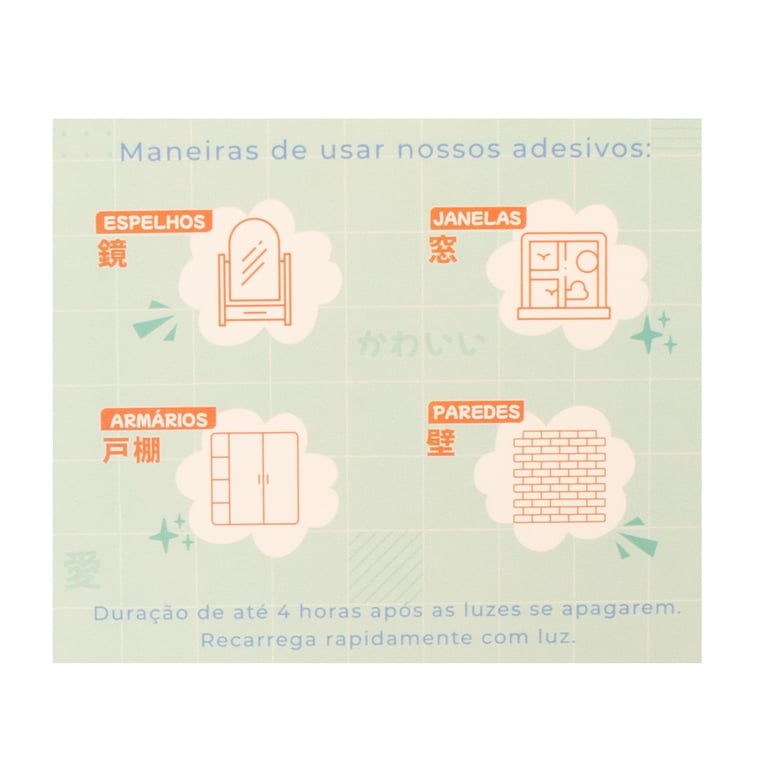 Sugestões de uso PARA DECORAR ESPELHOS, JANELAS, ARMÁRIOS, PAREDES, CADERNOS, AGENDAS
