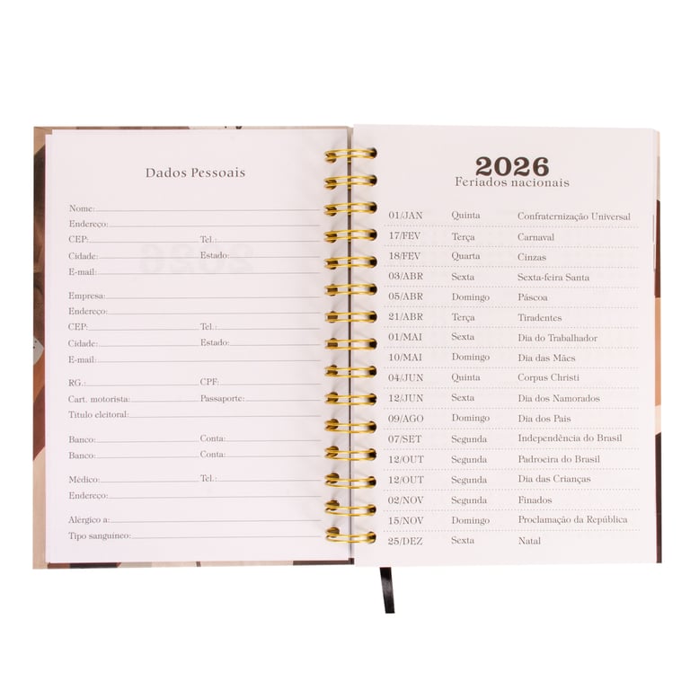 ESPAÇO PARA DADOS PESSOAIS,FERIADOS NACIONAIS, FOLHAS COM DIAS DO ANOS, MÊS, SEMANA E HORÁRIO