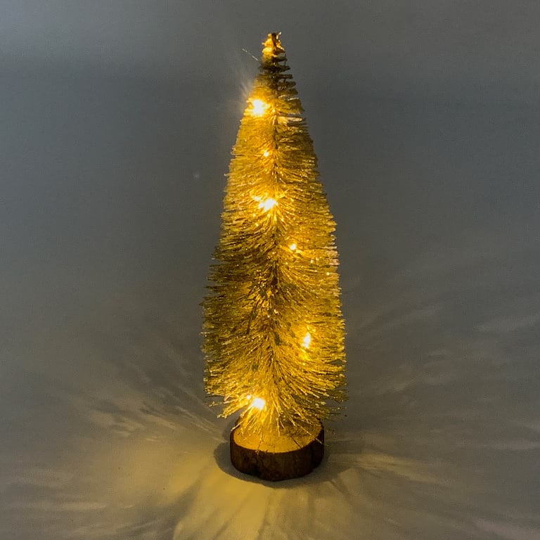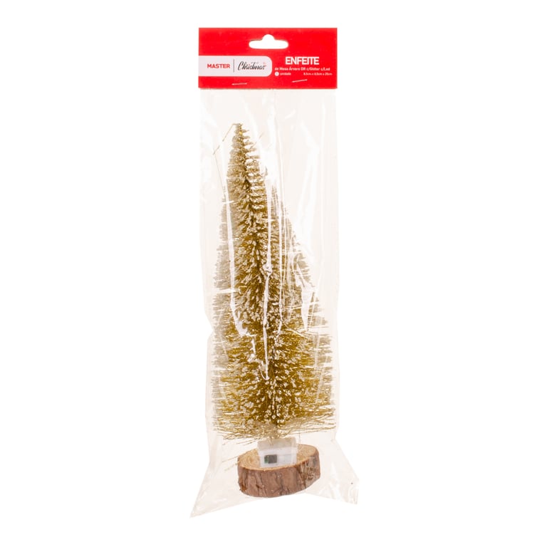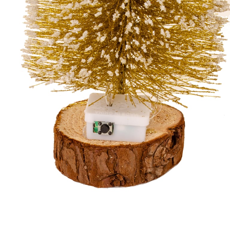 ÁRVORE NATAL DOURADA NEVADA 25 CM LED BRANCO QUENTE SUPORTE MADEIRA