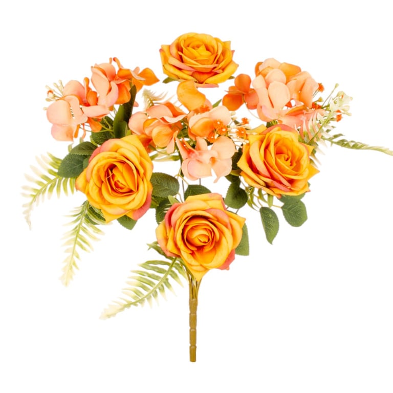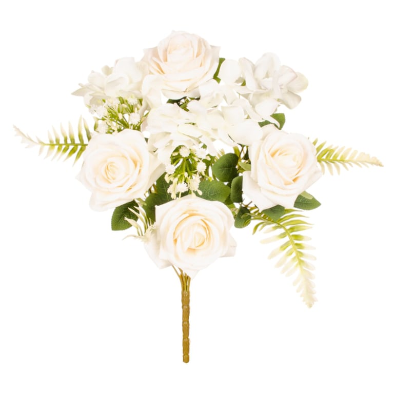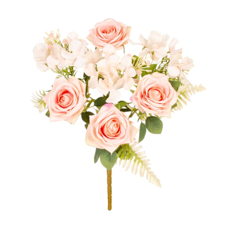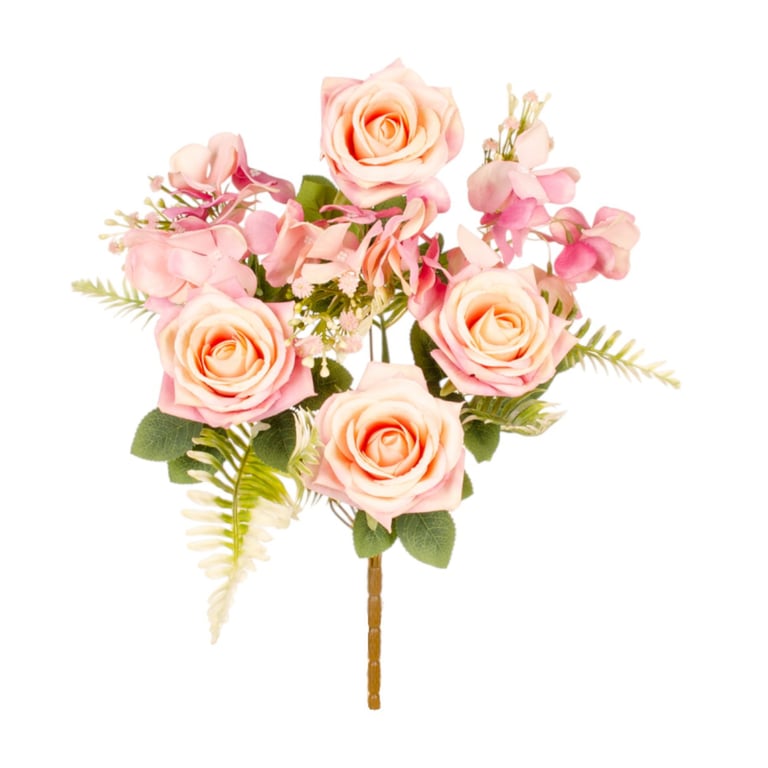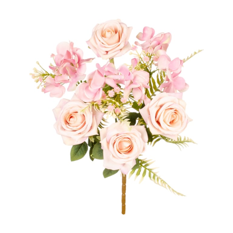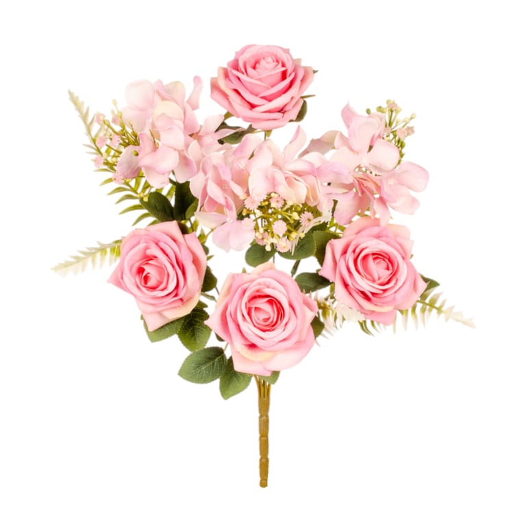 BUQUÊ ROSA X7 4 FLORES 42 CM COM HORTÊNSIA E SAMAMBAIA