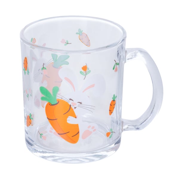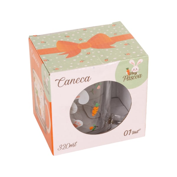 CANECA / XÍCARA VIDRO 320 ML FELIZ PÁSCOA COELHO COM CENOURA E FLORES