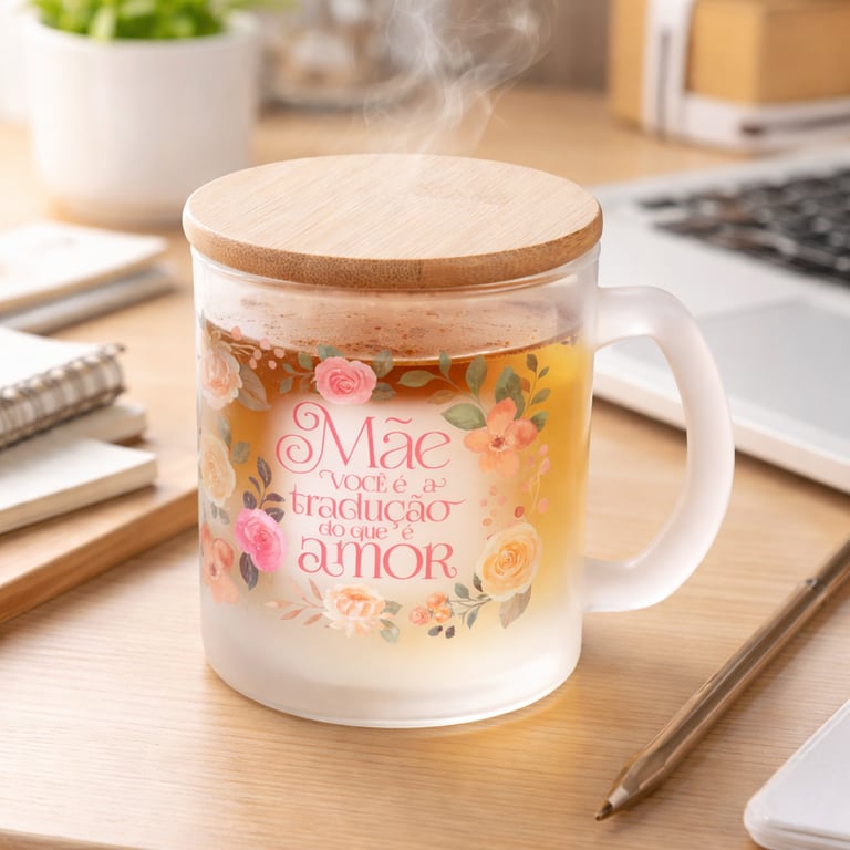 CANECA / XÍCARA VIDRO FOSCA 320 ML COM TAMPA BAMBU FRASE MÃE ROSA NA CAIXA