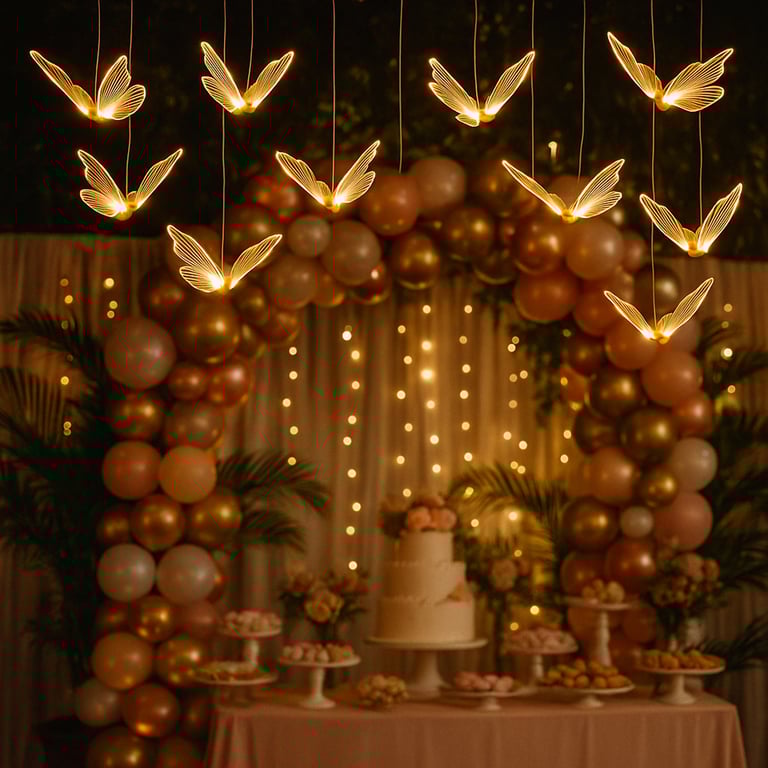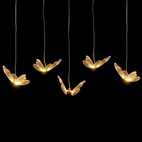SÃO 10 BORBOLETAS EM ACRÍLICO LIGADAS EM UM SUPORTE COM LUZES DE LED PENDENTE