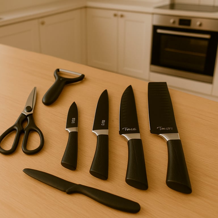 Mais medidas DESCASCADOR:14X6 CM TESOURA:20X9 CM FACA MENOR:18 CM FACA MÉDIA:28 CM FACAS MAIORES:29 CM